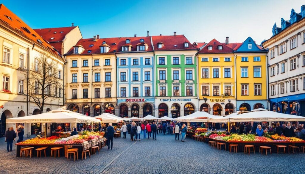 도시의 중심인 흐라브나 광장(Hlavná)에는 다채로운 색상의 3층 건물들이 늘어서 있으며, 많은 건물이 카페와 바(Bar)로 운영되고 있어 여름이 끝날 때까지 활기가 넘친다.